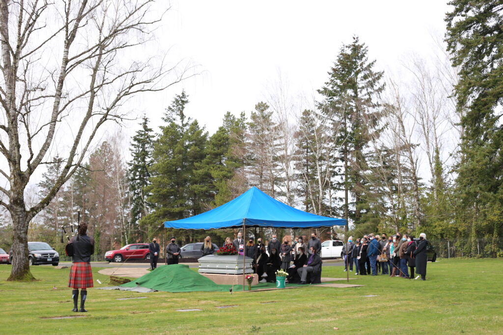 It is an overcast day, a gray day, but still light. There is a red and gray kilt-clad bagpiper standing on a field of grass in the bottom left corner with his back to us. His stance gives the impression he is playing. The grass is well groomed with hues of yellow and green mixed in. There is a blue canopy in the center of the photo sheltering a closed silver trimmed gray casket that lies upon what looks like a bronze hued pedestal. The pedestal is actually the bottom of a grave box designed to protect it from water damage, but the casual observer would not know this. A couple lines of grave markers are set into the earth in the foreground that may not be immediately visible. There is an astroturf covered mound behind the casket, presumably covering the dirt that has been displaced by the digging of the grave. Lying flat on the grass, are several plywood panels. A large bouquet of beautiful red roses lie atop the casket and a green University of Oregon bucket with white and yellow roses sit beside it. Also nearby is a small vase of red and white flowers.